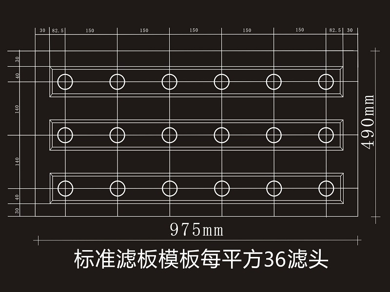 A型模板长×宽×高(975×490mm×55mm),厚度3.0mm,误差0.2mm;可安装滤头数量18个/块和21个/块。相当于36个滤头/㎡(纵向间距150mm,横向间距140mm),42个个滤头/㎡(纵向间距130mm,横向间距160mm)滤梁中心间距1000-1060mm。