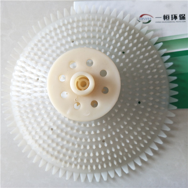 旋混式曝气器是由连接接咀,旋混芯分流圈、夹层扩散齿罩、扩散倒齿罩,空气干管、空气支管、水平调节支架、空气排污装置、等主要部件组成,空气由配气管道进入曝气器,气流会使橡胶空气止回阀产生上下变隙运动,再通过分流圈的扩散内齿、夹层扩散齿罩上下齿、倒齿扩散罩对上浮运动的气泡起多重碰撞破碎的动力扩散的作用。曝气器与空气支管的连接是采用市场上通用的标准粗螺纹连接。